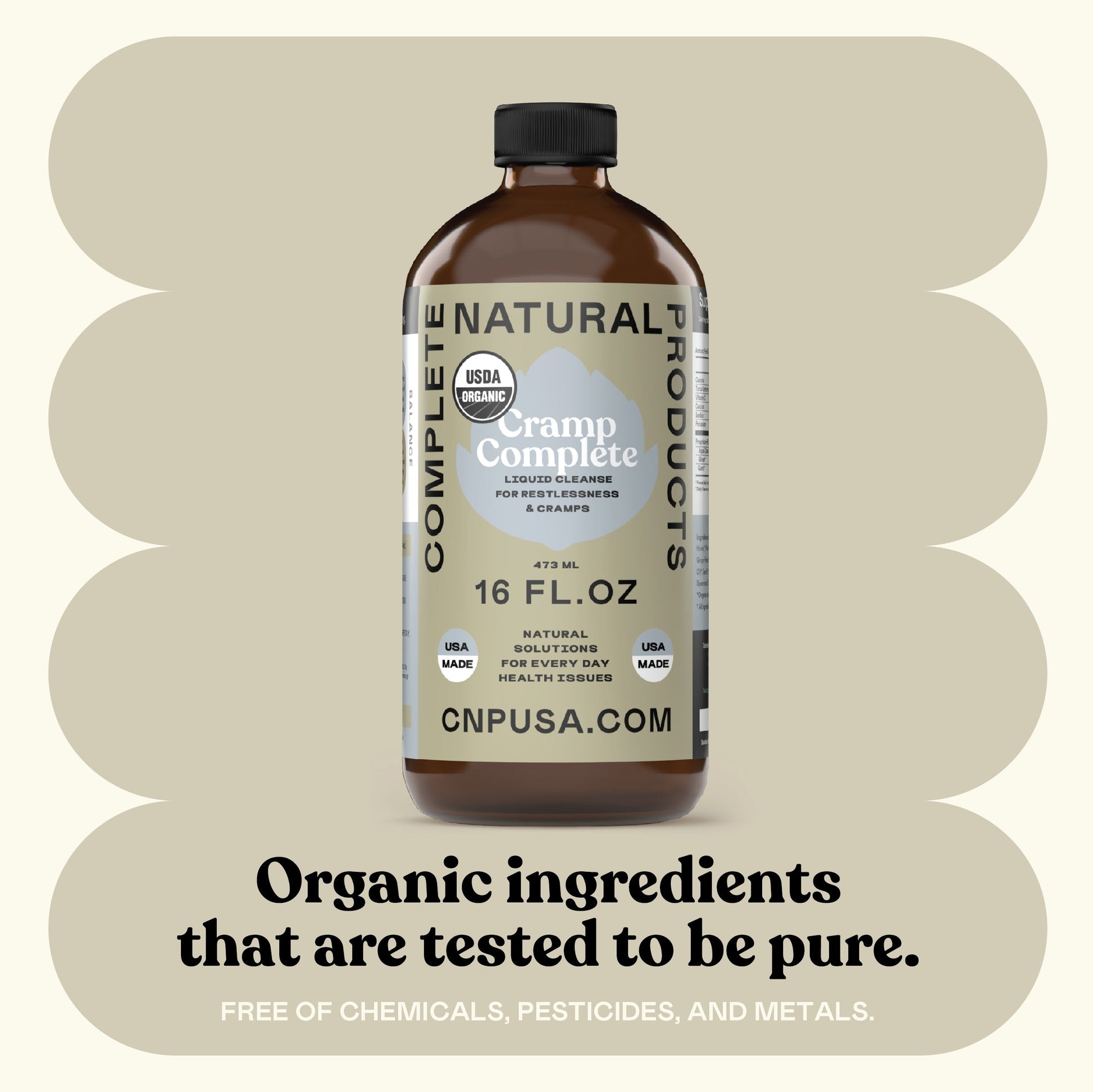 Leg Cramp Complete is an all natural combination of herbs, minerals, amino acids, and vitamins in a smooth blend of fruit extracts and raw organic apple cider vinegar addressing the issues of leg and foot cramps, restless legs, and the issues associated with muscle cramping, dehydration, and electrolyte restoration.