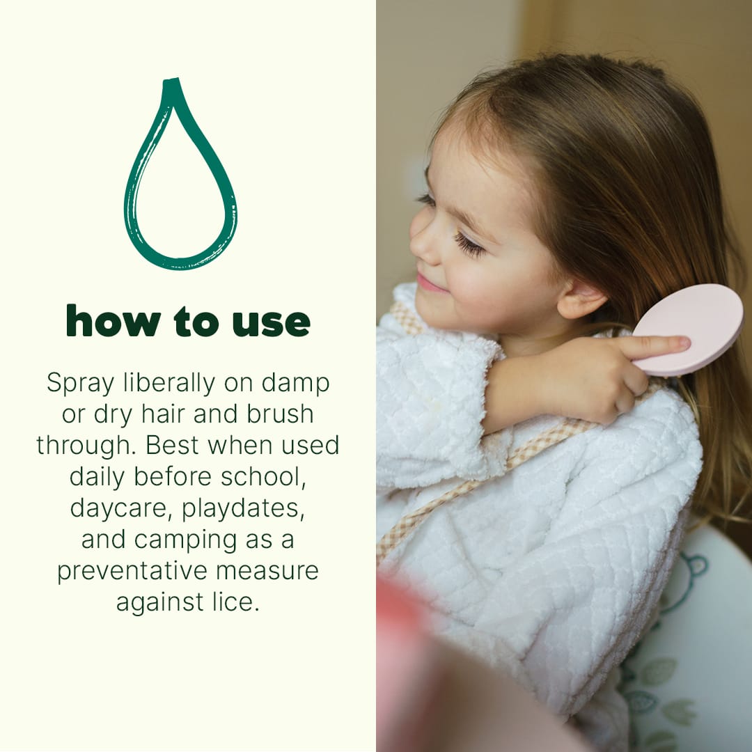 Keep head lice at bay naturally with our Critter Away Hair Shield Spray. Powered by essential oils known to deter these hair nuisances, this spray helps keep hair clean and free while softening each strand and leaving behind a light, refreshing herbal scent. Discourage these highly contagious tiny terrors before they settle in with pure essential oils like Tea Tree, Lavender, Eucalyptus Dives, Geranium, Citronella, Spearmint, and more! Each essential oil in our propriety blend was chosen for their repellent properties, creating an undesirable environment for lice. Plus, coating strands in this conditioning spray also makes it difficult to attach to hair shafts, giving them another reason to stay away. Hair will be treated to nutrient-rich botanical ingredients like Argan Oil, Aloe Vera, and hydrolyzed jojoba proteins, which help smooth, soften, and detangle hair while offering instant hydration.