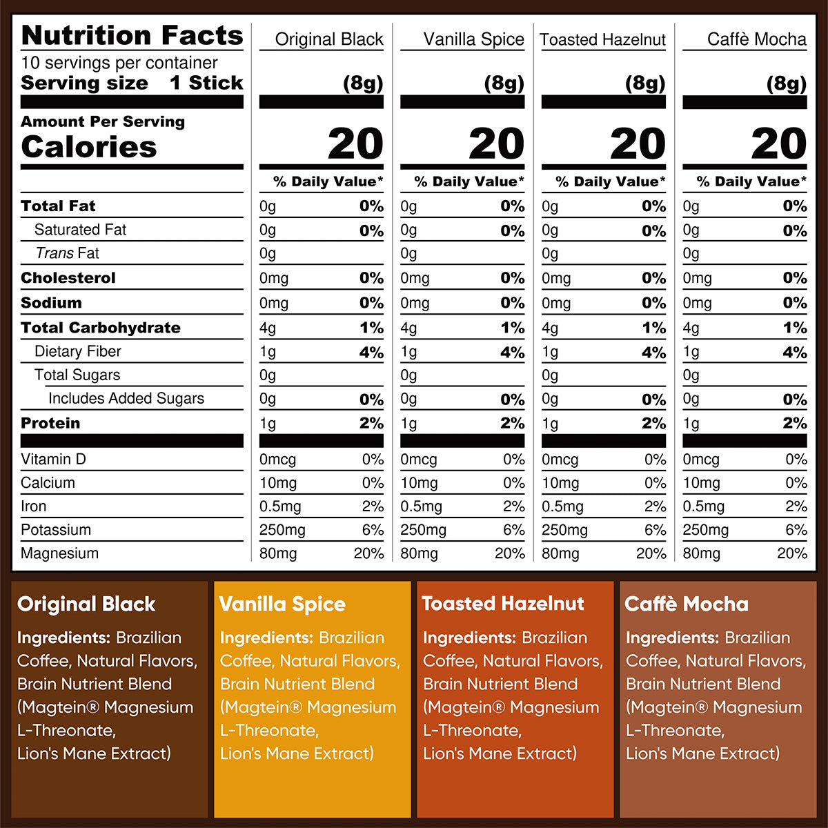 Meet the brews that started it all. Our Original Variety includes 40 instant coffee stick packs in four fan-favorite flavors: 10 Original Black, 10 Toasted Hazelnut, 10 Vanilla Spice, and 10 Caffè Mocha. Whether you're at home or on the go, each stick delivers bold flavor and smooth energy—no coffee shop required.