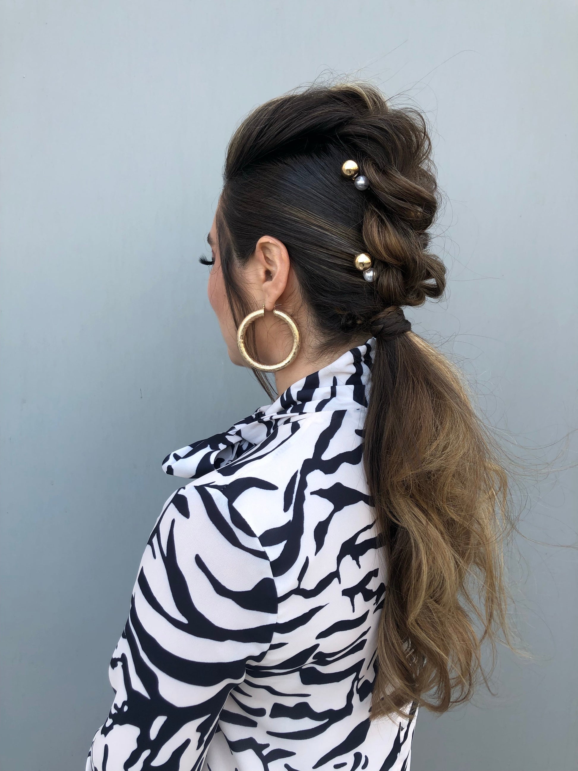 The bobby pin is 2.65" in length. The pearl on the end is about 0.35" in diameter and the larger gold ball is about 0.65" in diameter.