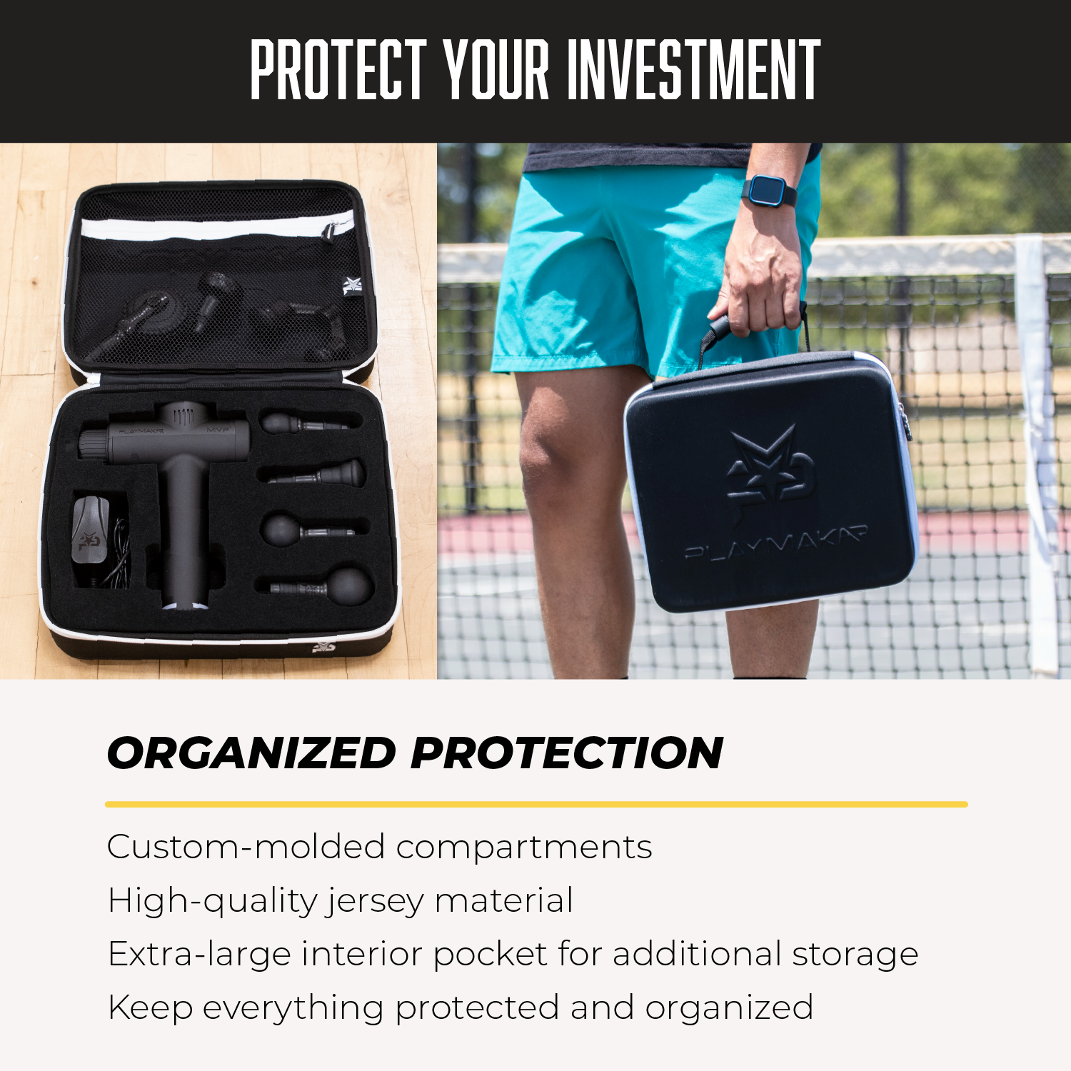 This case is the perfect companion for the MVP+ Percussion Massager. Its molded compartments are designed to fit your MVP+ Massager, four massage heads, and charging device, plus an extra-large interior pocket for additional storage space. (Case only. Massager and accessories sold separately.)