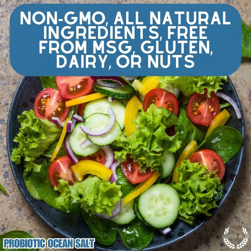 Ingredients: California Sea Salt, Ganden 360 Probiotics (contains Soy).
