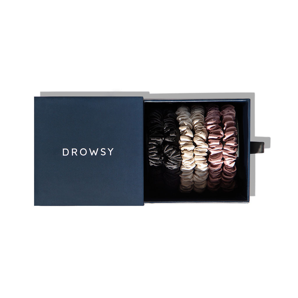 Skinny silk scrunchie set in our best-selling rose, dusty and black colour ways. These beauty essentials elevate your hair health and style from AM to PM. Keep your delicate hair protected from damage at all times with our 22 momme silk.