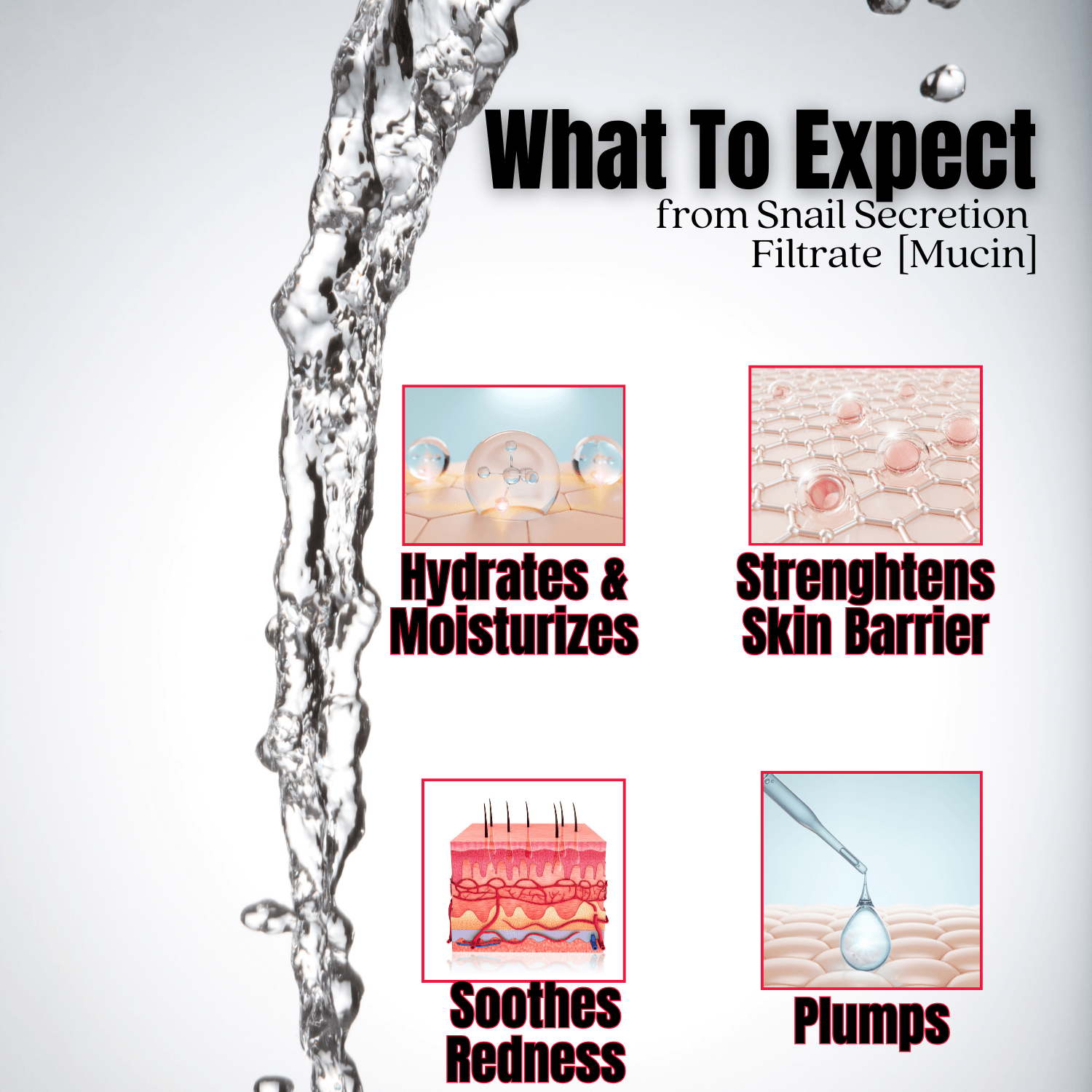 • 98 % Snail Secretion Filtrate: Rich in mucopolysaccharides, proteins and peptides that deliver intense hydration, support collagen synthesis and accelerate barrier repair.