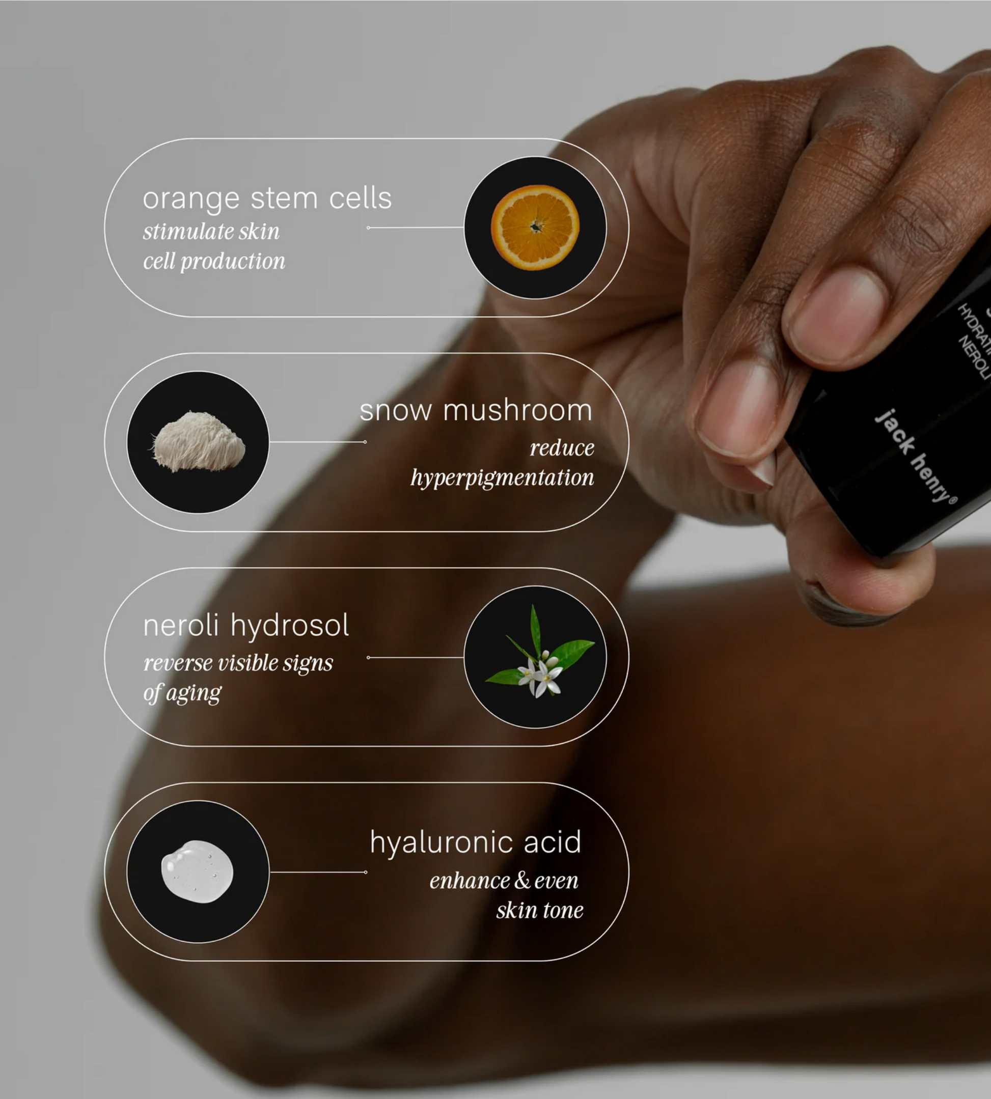 water, neroli hydrosol, orange stem cells, lactobacillus ferment, snow mushroom, Japanese hydrolyzed hyaluronic acid, tara gum, aspen bark extract, sandalwood essential oil, neroli essential oil