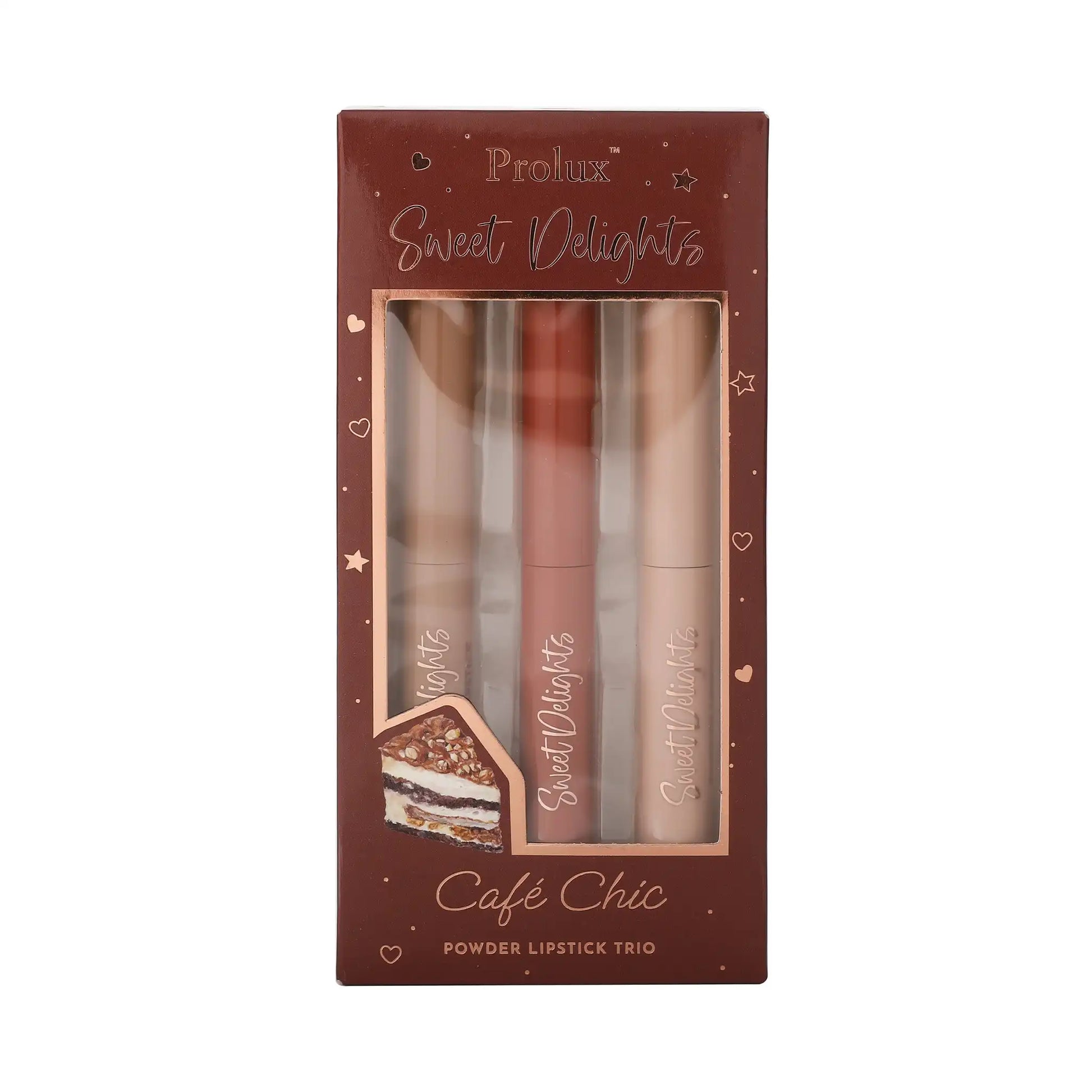 Prolux Sweet Delights Powder Lipstick Trio features 3 vibrant powder lipstick shades with a soft matte finish. This cruelty-free lipstick trio offers long-lasting blendable color in a compact and travel-ready design. Perfect for bold lips, gifting and dessert-inspired beauty looks.