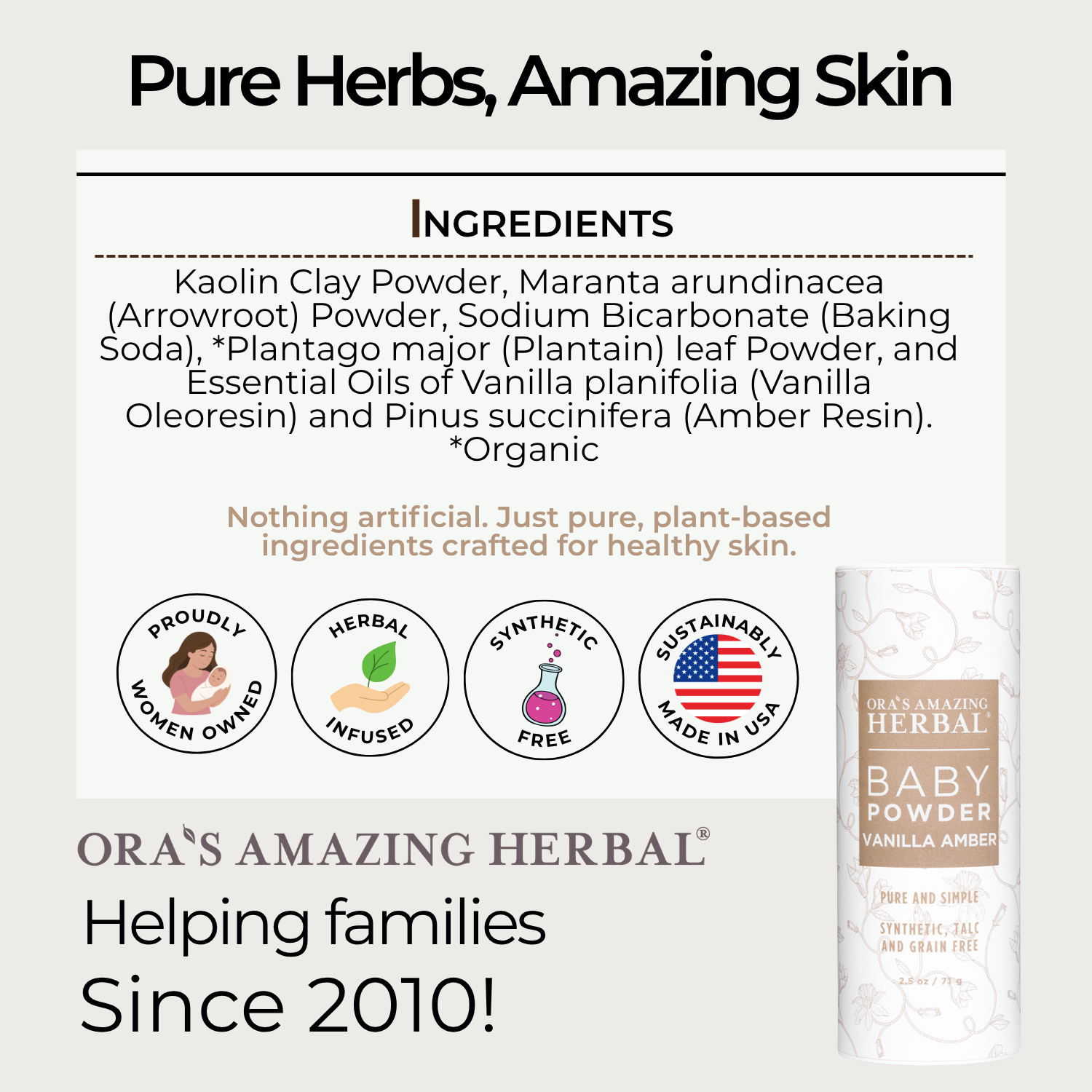 Keep that squishy tushy dry, soft, and fresh. This talc free powder absorbs moisture, balances pH and soothes irritated skin. Subtly scented with organic raw vanilla and amber essential oils only.