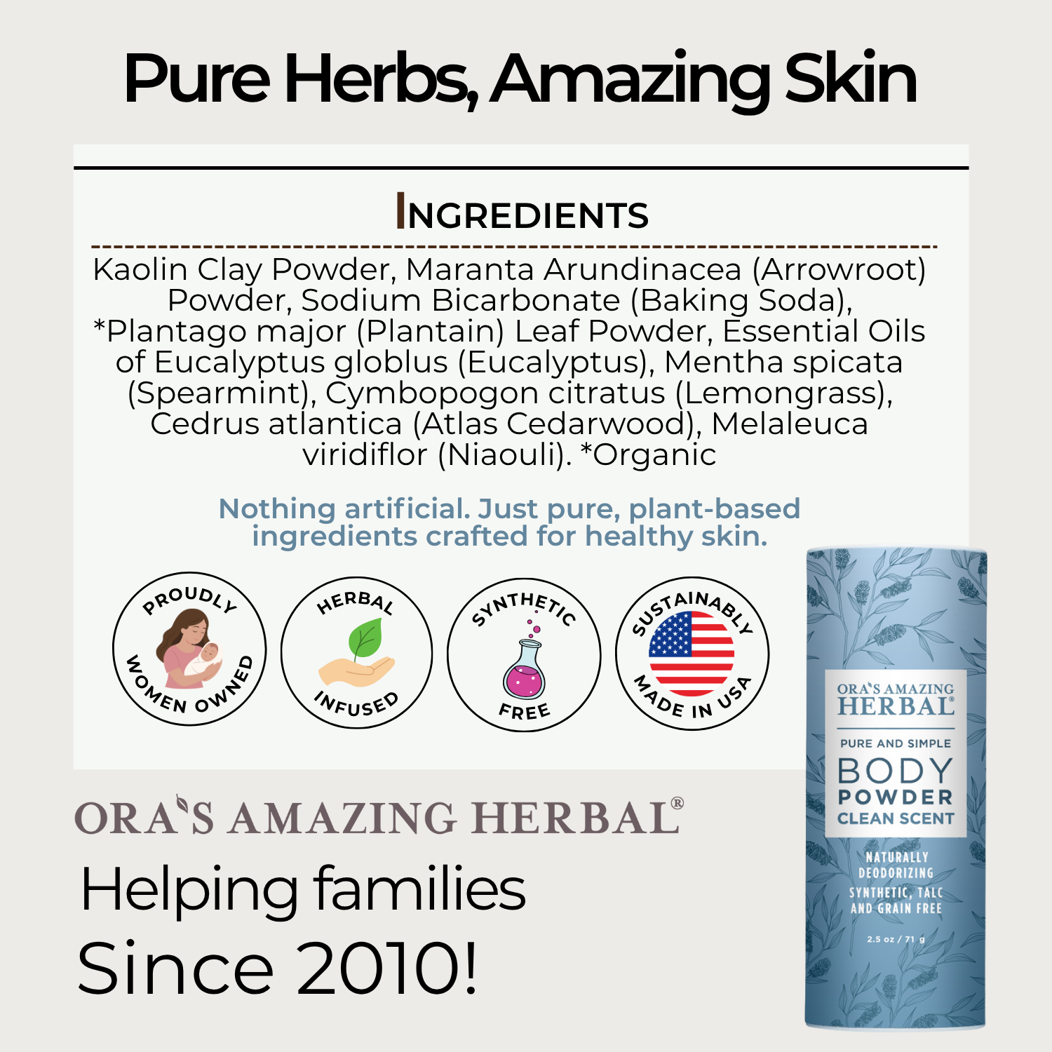 Slightly minty talc free body dusting powder with lemongrass, eucalyptus, cedar and mint essential oils. Clean scent is a fave for men and women alike. Talc & corn free.