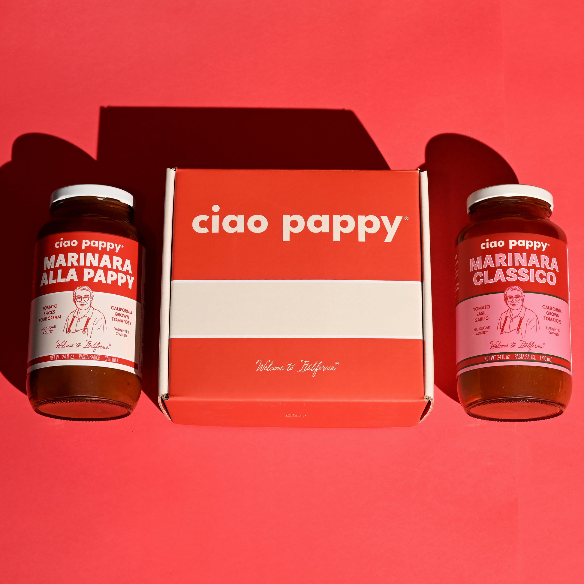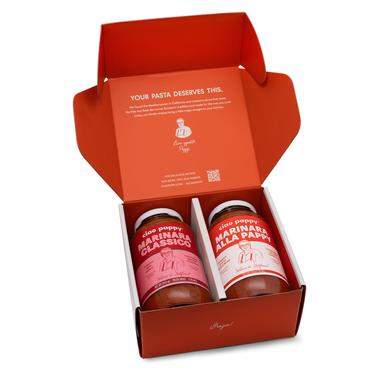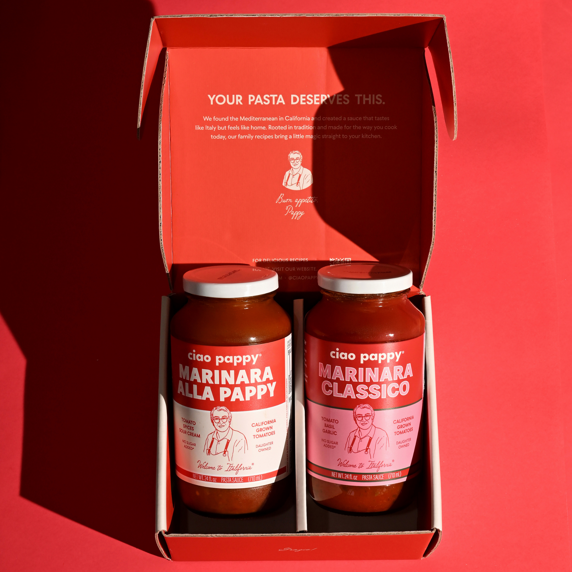 Each set of two sauces are shipped in custom Ciao Pappy gift boxes.