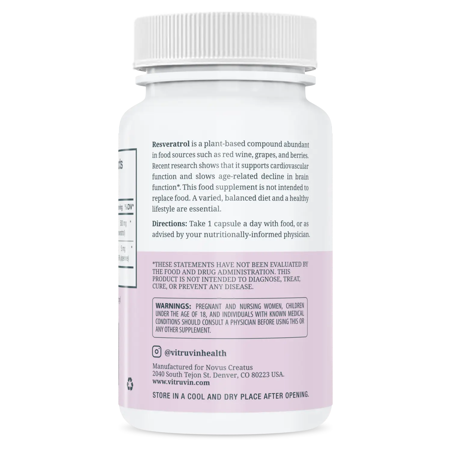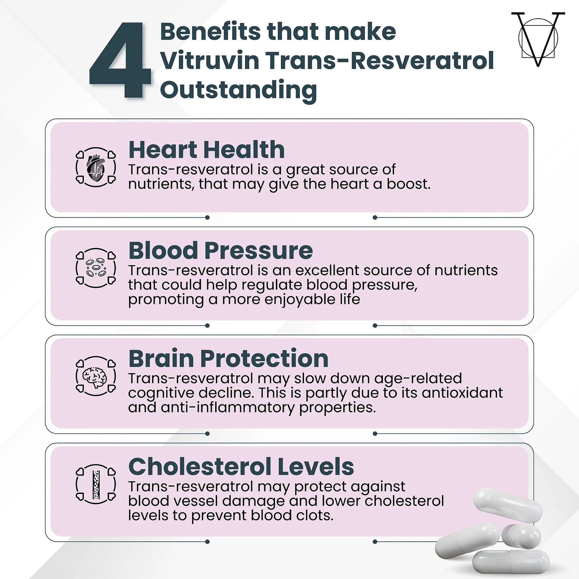 If we want to experience life to the fullest, the heart needs to be full of life and health. Without heart health, all other health begins to fail. With Vitruvin Trans-Resveratrol, you can harness the power of rich nutrients to support your heart, maintain good blood pressure, and move through life full of energy. We make our product from natural extract, and we use piperin in our formulation, in order to improve bioavailability. Our product is tested in an ISO certified 3rd party laboratory, and manufacturing is approved by FDA.